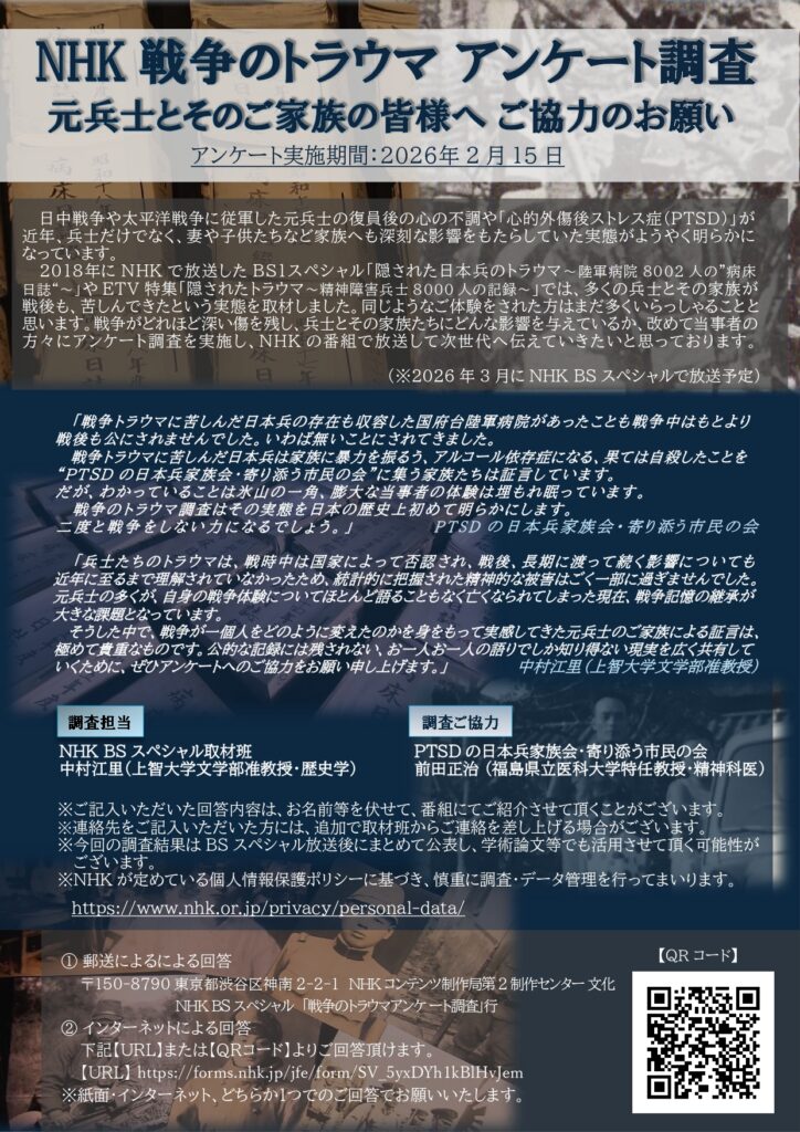 現在、NHKBSスペシャル取材班の方と共同で、戦争トラウマのアンケート調査を実施しております。(回答期限は2025年12月末まで2026年2月15日まで