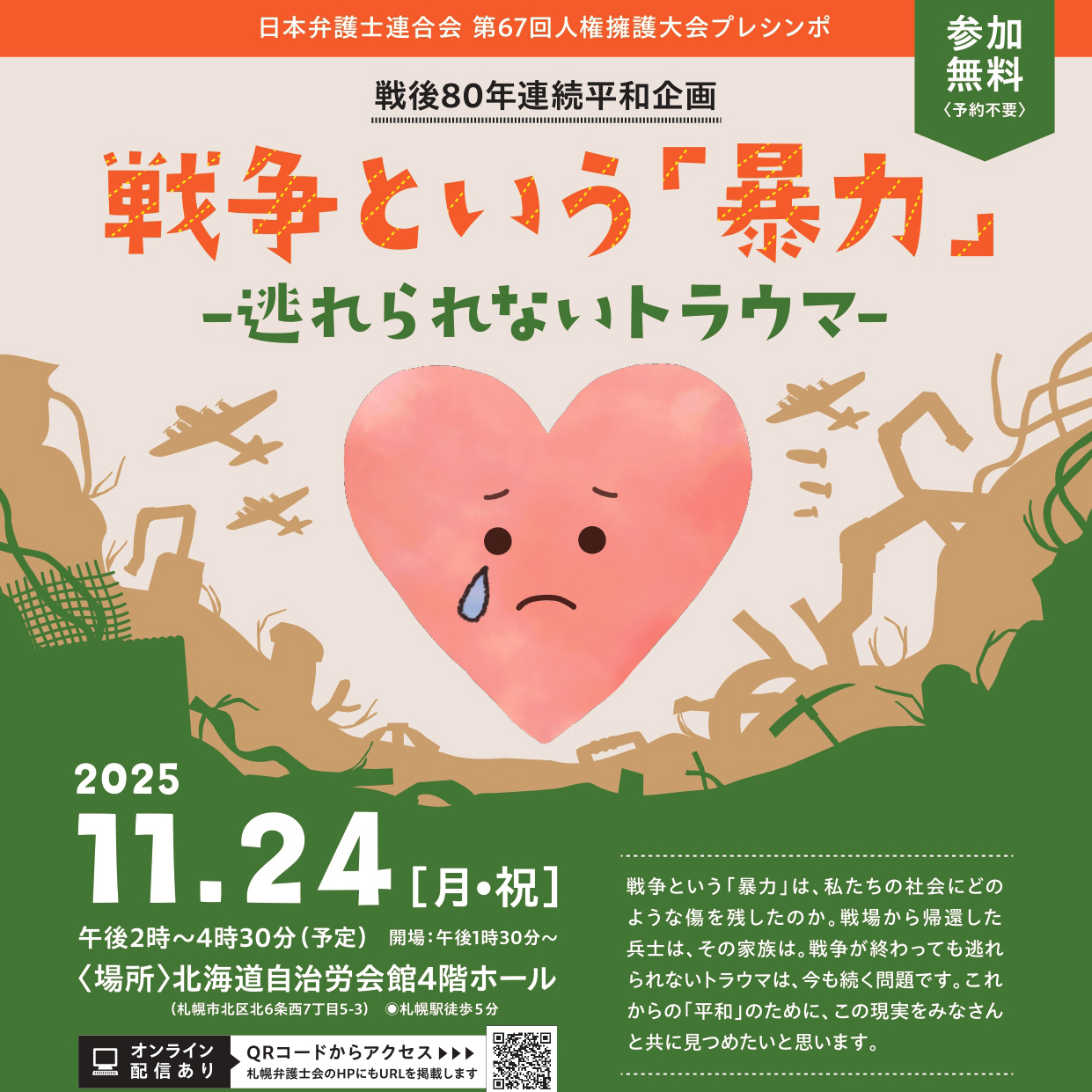 札幌弁護士会主催 戦後80年連続平和企画 戦争という「暴力」-逃れられないトラウマ(11/24)