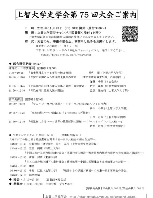 • 上智大学史学会第75回大会シンポジウム「東アジアの総力戦と戦後変革を再考する―日中比較史の新たな地平へ」(11/23) (10/22/2025)